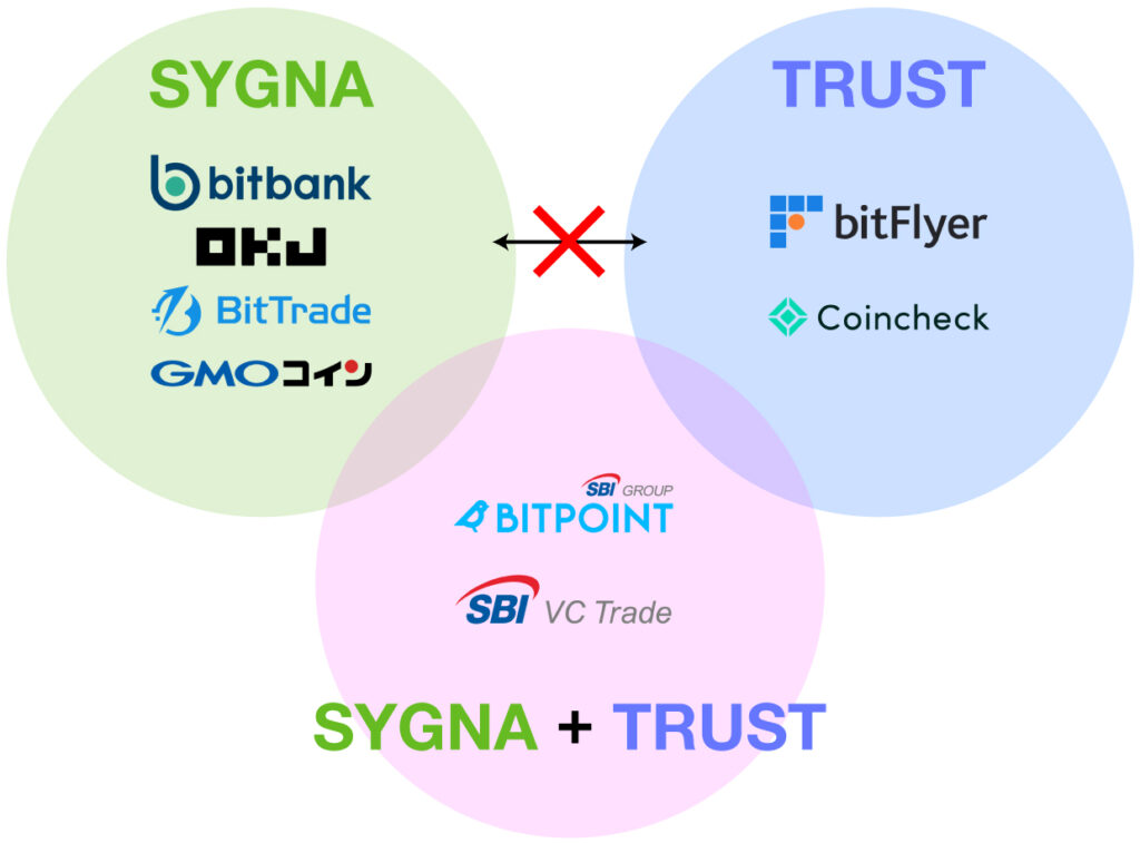 国内の取引所で採用されている主なソリューションには、「SYGNA」「TRUST」の2種類があります。それぞれ同じシステム間でのみ互換性があり、異なるシステム間では原則として仮想通貨を送金できません。
